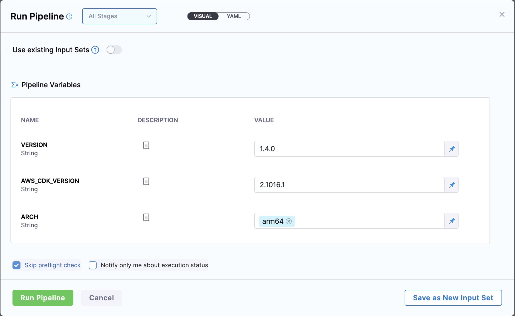 • Pipeline Variables: Be ready to set variables like VERSION, AWS_CDK_VERSION, ARCH, and TARGET_REPO at runtime or with defaults.