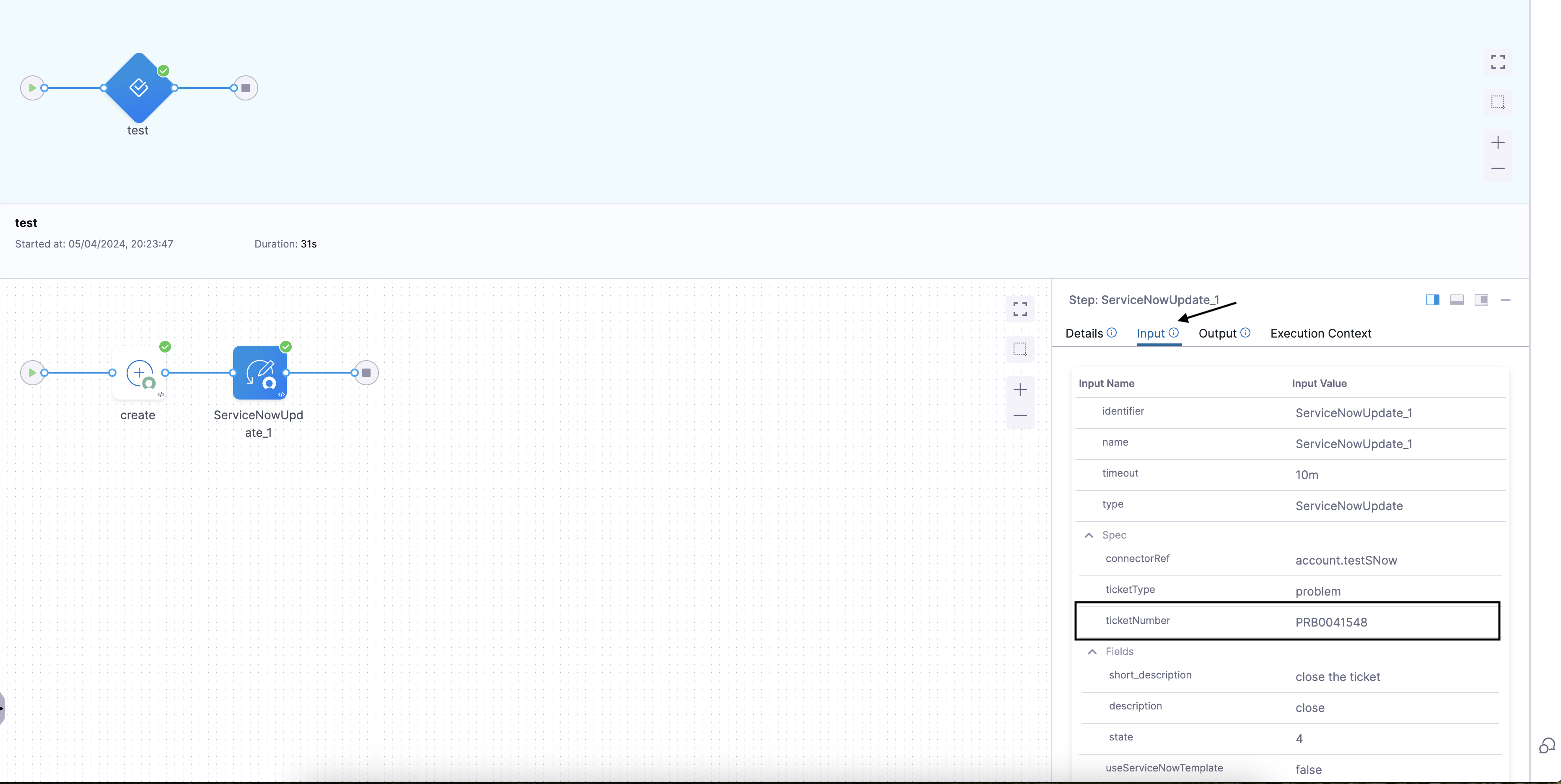 step, you'll notice that the ticket number is retrieved from the expression <+execution.steps.create.ticket.ticketNumber>