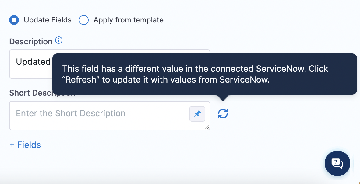 (Applicable only if the ticket number is a fixed value) Scan the list of fields for a refresh icon, and then click the icon next to each field to fetch the latest value from ServiceNow. Harness displays the refresh icon next to a field only if that field has been updated in ServiceNow.