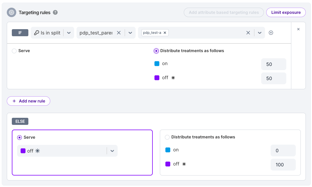 We create a parent feature flag named pdp_test_parent with four treatments, one for each of the experiments, as well as a not-in-experiments treatment. In this example, we use a percentage-based targeting rule to divide traffic, but you could also use attribute-based targeting rules.