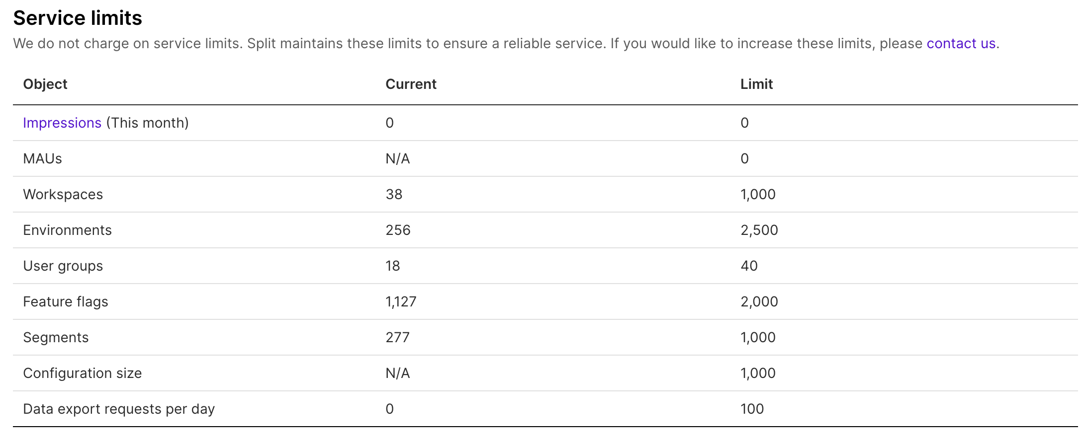 Under the Service limits section, you can find your current service limits. Harness FME maintains service limits for each account to help guarantee the availability of the Harness FME service, as well as to minimize billing risks to customers. Harness FME service limits require that you request limit increases manually.