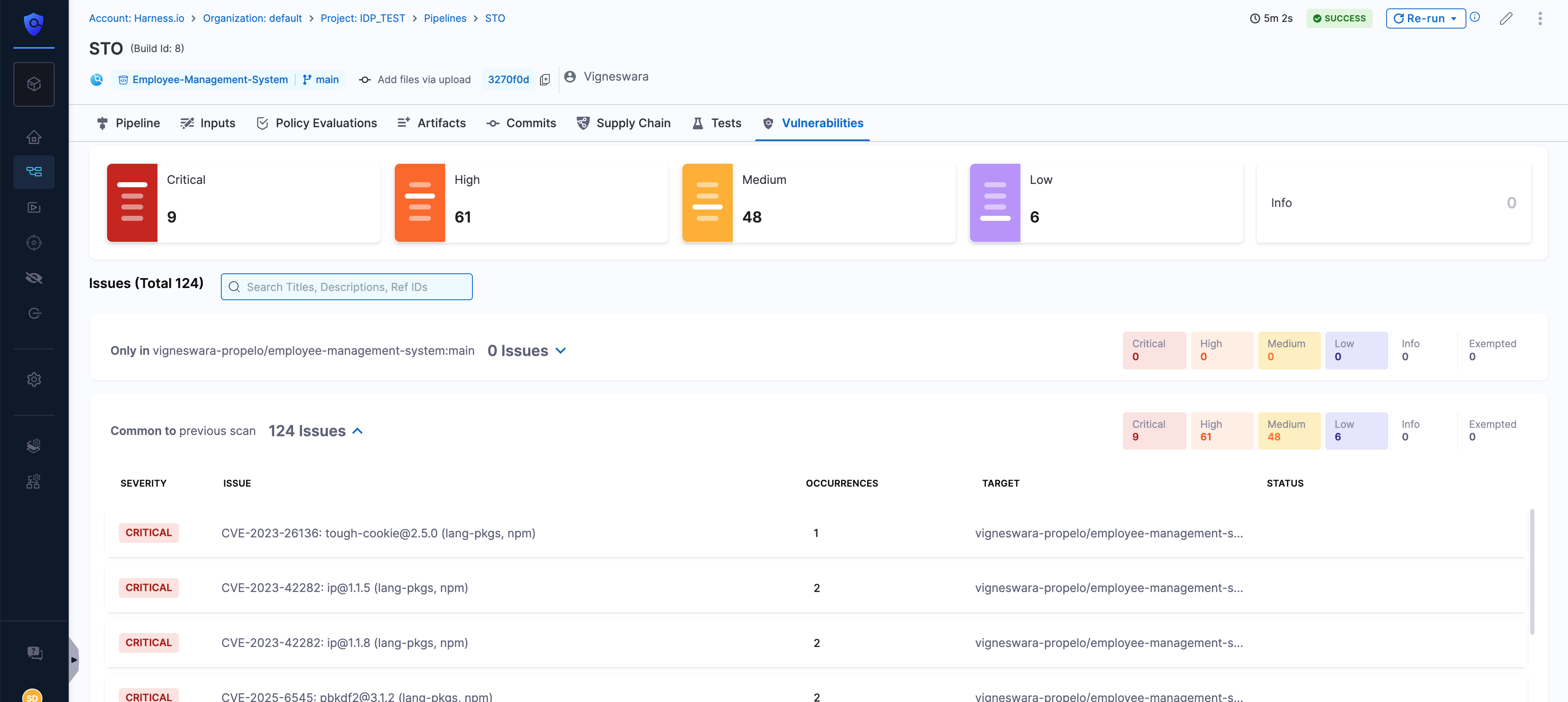 We have a Security Test Orchestration (STO) pipeline that runs scans using Snyk and Aqua Trivy to detect vulnerabilities in our services. Once the scans are completed, the findings are processed and stored within STO, and the pipeline has some vulnerabilities, which will become the source of truth for us. With the integration of STO with IDP in place, these vulnerability insights will be viewed directly inside IDP.