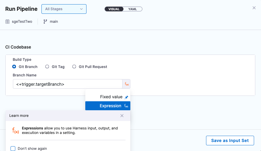 For the Branch Name, select Expression and enter <+trigger.targetBranch>