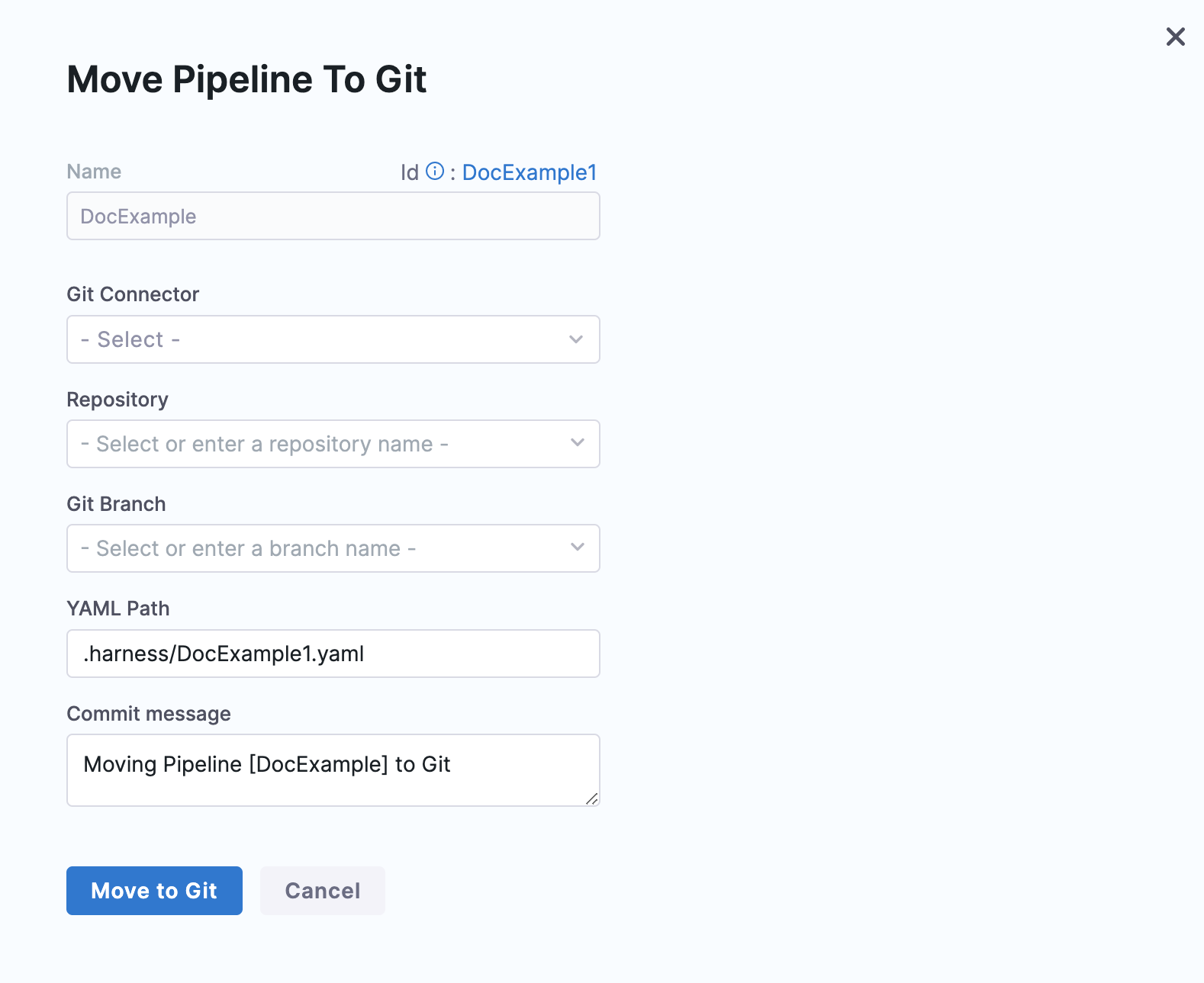 When you move an inline pipeline to Git, the pipeline's associated entities aren't automatically moved to a Git repository. You must also move the corresponding input sets to the remote repository.