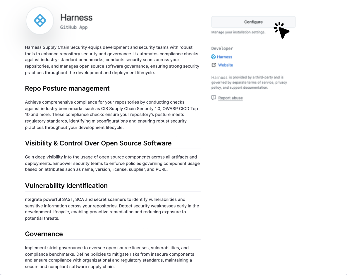 1. Visit the Harness-SCS GitHub app and click the ‘Configure’ button.