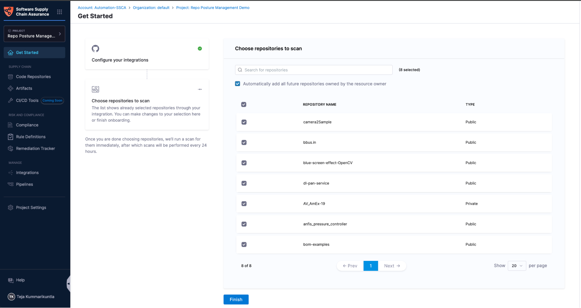 You can select Configure in the Repo Security and CI/CD Security option. This will take you to a new screen with two steps: configuring your integration and selecting the repositories to scan.