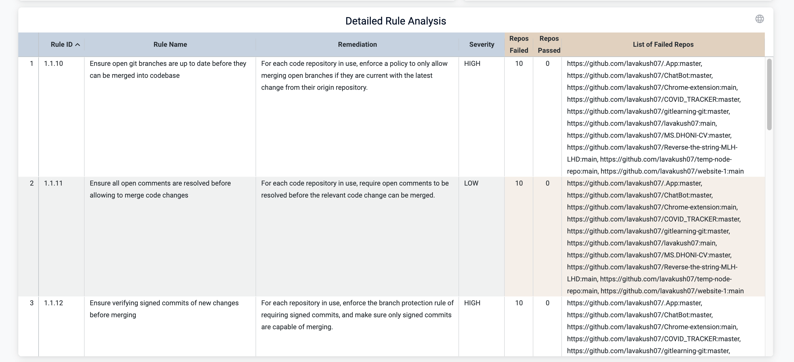 Provides a breakdown of all evaluated compliance rules, showing the number of repositories that passed or failed each rule which helps to pinpoint compliance gaps across standards like CIS and OWASP.