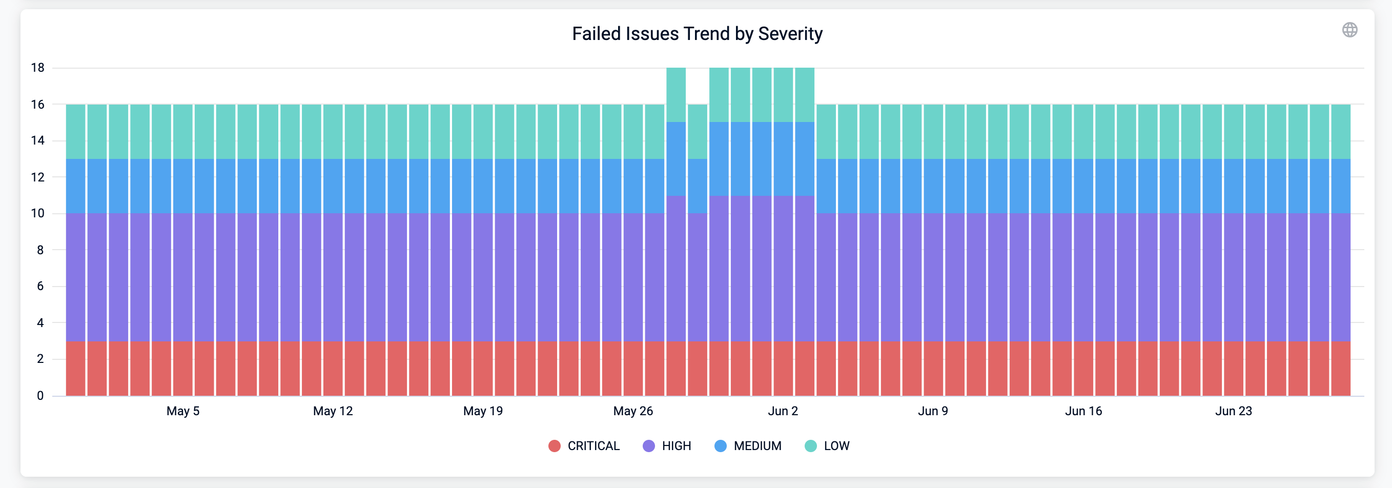 Tracks the daily count of failed compliance checks by severity, helps you to quickly spot spikes, regressions, and assess repository risk posture over time.